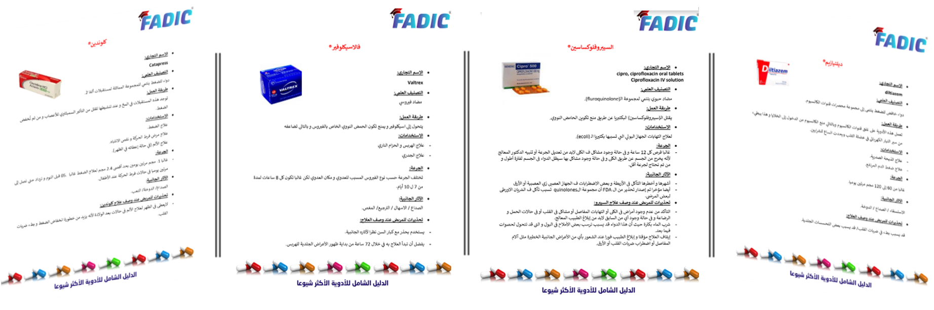 في هذا الكتاب يقدم فادك الدليل الشامل لأشهر الأدوية التي توصف للمرضى كأداة سريعة يمكن الوصول إليها بسهولة لكل من الأطباء والصيادلة وجميع مقدمي الرعاية الصحية من أجل توفير مستوي رعاية صحية أفضل للمرضب. هذا الدليل الشامل للأدوية الأكثر شيوعاً يوفر لك اكثر من ١٠٠ دواء مع استعمالاتها وموانعها و اسمائها العلمية والتجارية في صورة كارد ملخص جذاب لكل دواء, استكشف الدليل الشامل للأدوية الشائعة واحصل على توجيهات قيّمة حول استخدامها، وتأثيراتها الجانبية المحتملة، والجرعات الموصى بها، والمزيد.